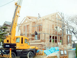 柱・梁の溝に添って3cm厚のムク杉板を落とし込みます。金物を使用しない木組みの建物です。