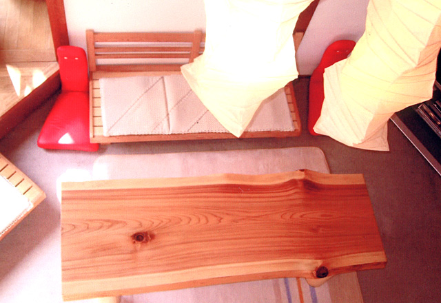 天板は高知県土佐の杉、一枚板です。天板と脚を一体化させると移動が困難な為、分離出来る様にしてあります。